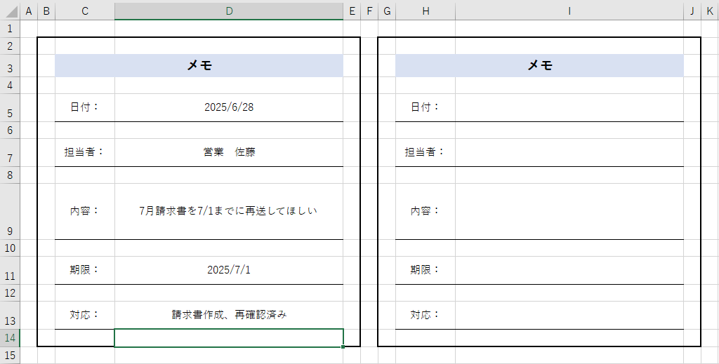 日付・相手・用件・期限・対応者の欄があらかじめ設定されており、書く項目に迷いません。
